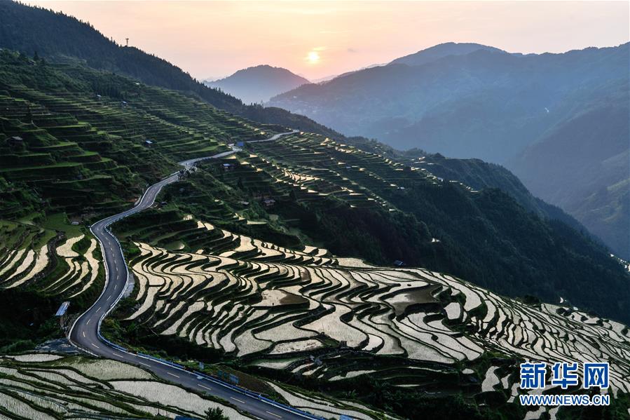 晨光中的從江縣加榜鄉(xiāng)加車梯田(5月28日攝)。夏日時(shí)節(jié),位于貴州省黔東南苗族侗族自治州從江縣加榜鄉(xiāng)加車、加頁(yè)、黨扭等苗寨的梯田在晨霧與陽(yáng)光的映襯下線條分明,光影變幻,景色如畫(huà)。新華社記者 楊文斌 攝