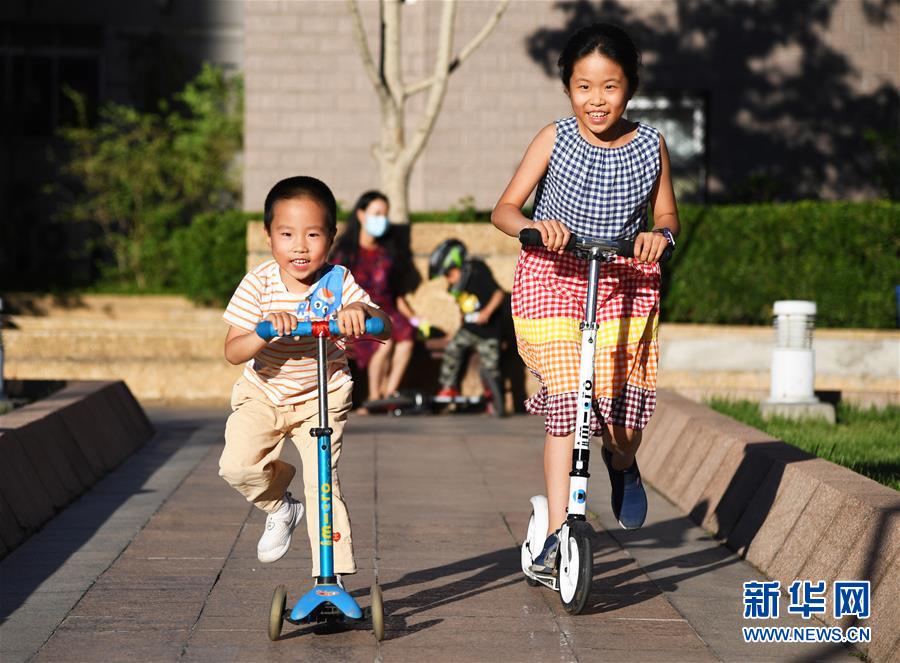 5月31日,在北京市海淀區(qū)中關村街道新科祥園社區(qū)廣場,小朋友們在玩耍。新華社記者任超攝