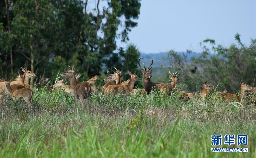 一群坡鹿在海南邦溪坡鹿自然保護區(qū)內(nèi)休憩(4月3日攝)。新華社記者楊冠宇攝