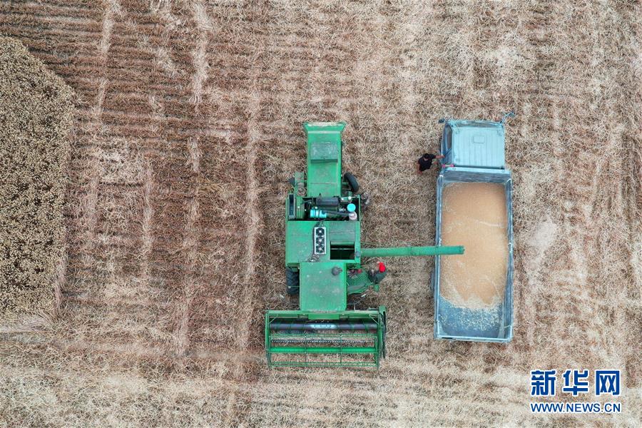6月2日,在河南省黃泛區(qū)農(nóng)場(chǎng)九分場(chǎng)的麥田里,農(nóng)民操作大型收割機(jī)收獲小麥(無(wú)人機(jī)照片)。新華社記者馮大鵬攝。