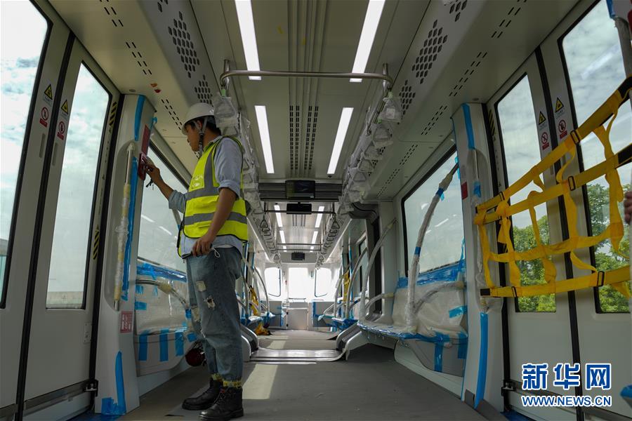 6月3日,工程技術(shù)人員在“云巴”車廂內(nèi)對安裝的電氣設(shè)備進(jìn)行調(diào)試。近日,重慶市首條“云巴”示范線項(xiàng)目在重慶璧山區(qū)正式亮相。此次發(fā)布的“云巴”采用電能驅(qū)動,具有轉(zhuǎn)彎半徑小、爬坡能力強(qiáng)、噪音低、安全性高、建設(shè)成本低、建造周期短等優(yōu)勢,能為乘客提供更智能、舒適、便捷的出行體驗(yàn)。據(jù)介紹,璧山區(qū)“云巴”示范線項(xiàng)目自2019年8月開建,線路正線全長15.4km,共設(shè)車站15座,預(yù)計(jì)2020年9月全線通車。新華社記者劉潺攝。