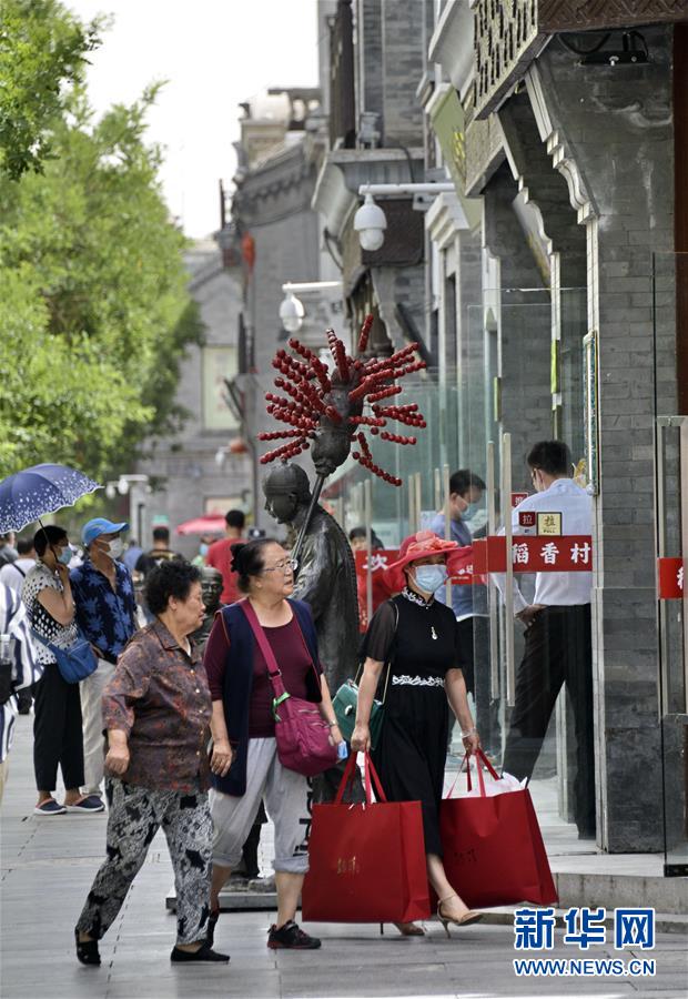 6月3日,市民及游客在前門步行街購物觀光。近日,游人和市民紛紛來到北京市的王府井、西單、前門大街等著名商業(yè)街購物休閑,這些老商業(yè)街開始逐步恢復(fù)昔日的繁華。新華社記者李欣攝。