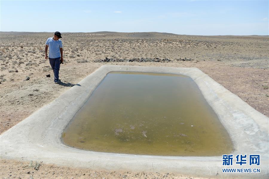在新疆卡拉麥里山有蹄類野生動(dòng)物自然保護(hù)區(qū),管護(hù)員阿達(dá)比亞特來到人工建設(shè)的水池查看蓄水情況(6月3日攝)。新華社記者丁磊攝。