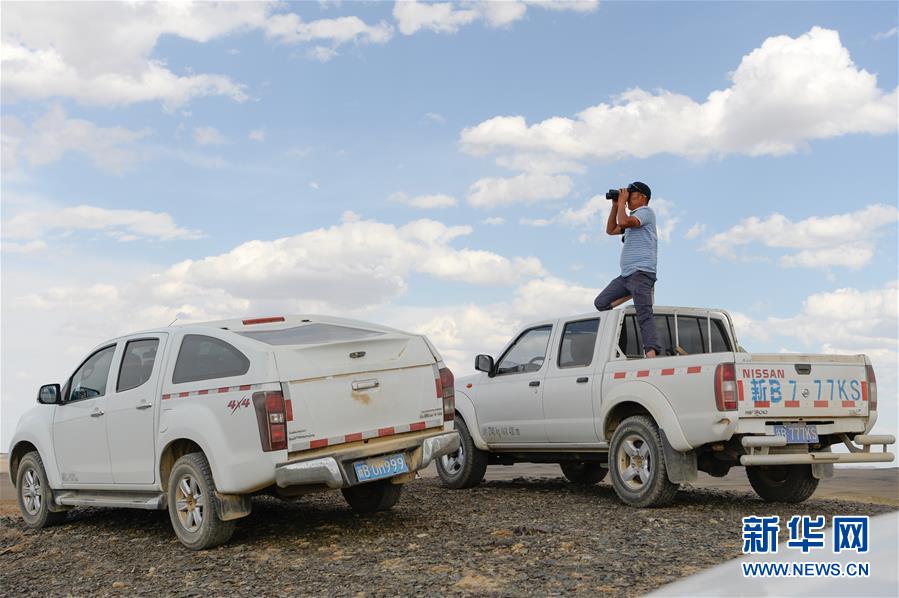 在新疆卡拉麥里山有蹄類野生動(dòng)物自然保護(hù)區(qū),管護(hù)員阿達(dá)比亞特在觀察遠(yuǎn)處水源地蓄水情況(6月3日攝)。新華社記者丁磊攝。