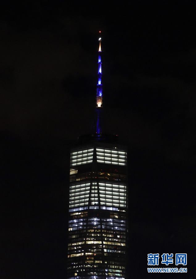 這是6月7日拍攝的點亮藍(lán)色和金色燈光的美國紐約世貿(mào)中心一號樓。新華社記者王迎攝