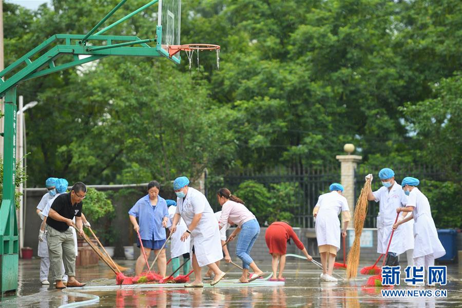 6月8日,在永州市江華瑤族自治縣白芒營鎮(zhèn)車下完全小學,工作人員在校園里清淤、沖洗地面。受近日持續(xù)強降雨影響,湖南省永州市江華瑤族自治縣發(fā)生洪澇災(zāi)害。6月8日,永州市江華瑤族自治縣白芒營鎮(zhèn)車下完全小學開展清淤、消毒工作,為6月9日恢復上課做準備。新華社記者陳澤國攝