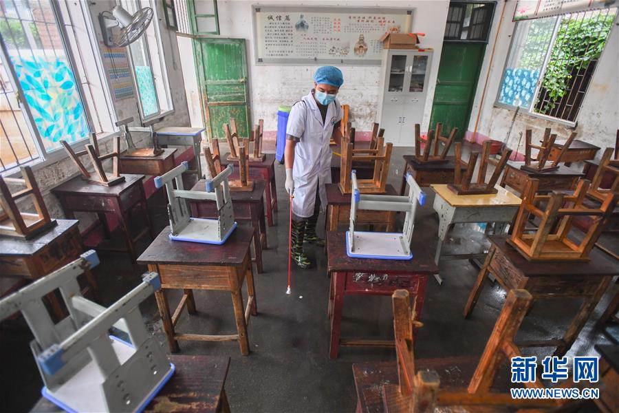 6月8日,在永州市江華瑤族自治縣白芒營鎮(zhèn)車下完全小學,白芒營中心衛(wèi)生院的工作人員在對教室進行消毒。受近日持續(xù)強降雨影響,湖南省永州市江華瑤族自治縣發(fā)生洪澇災(zāi)害。6月8日,永州市江華瑤族自治縣白芒營鎮(zhèn)車下完全小學開展清淤、消毒工作,為6月9日恢復上課做準備。新華社記者陳澤國攝