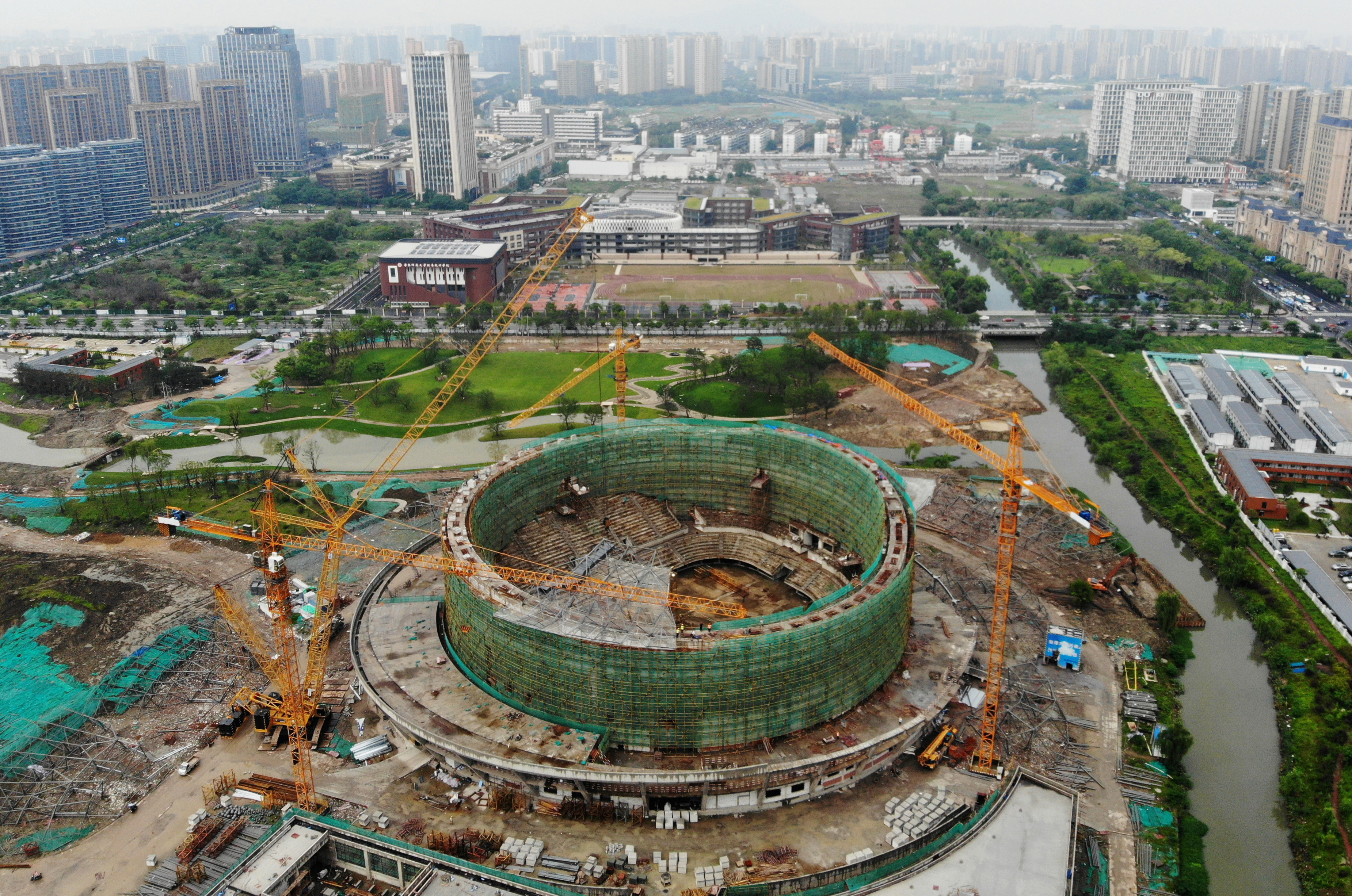 2020年6月9日,從空中俯瞰正在建設(shè)中的杭州亞運(yùn)會(huì)乒乓球館。