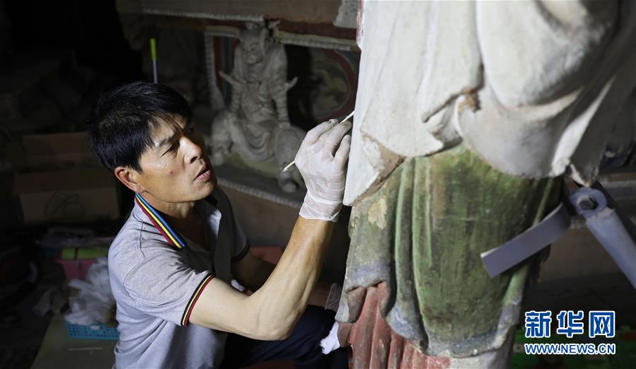 6月8日,工作人員對(duì)奉國寺的彩繪泥塑進(jìn)行保護(hù)修復(fù)。新華社記者姚劍鋒攝