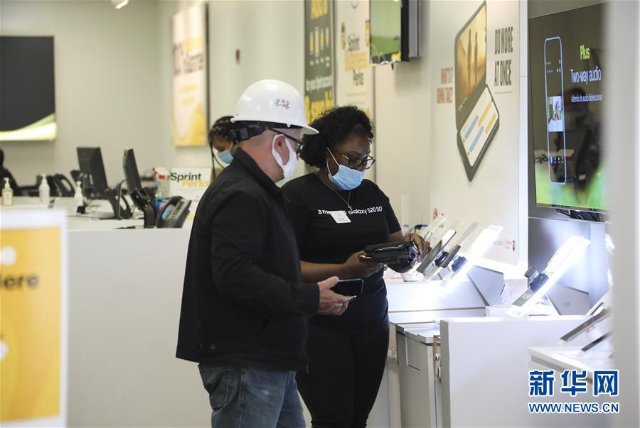 6月8日,店員(右)在美國(guó)紐約一家電信運(yùn)營(yíng)商營(yíng)業(yè)廳內(nèi)為顧客服務(wù)。在因新冠疫情進(jìn)入“居家令”近三個(gè)月之后,美國(guó)紐約市于當(dāng)?shù)貢r(shí)間8日開始“解封”,進(jìn)入經(jīng)濟(jì)重啟的第一階段。新華社記者王迎攝