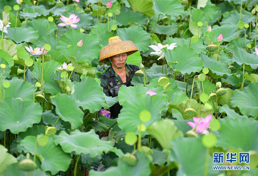 6月9日,村民在海口龍華區(qū)龍泉鎮(zhèn)美仁坡村采摘蓮蓬。初夏時節(jié),位于海南??邶埲A區(qū)龍泉鎮(zhèn)的蓮蓬逐漸成熟,當(dāng)?shù)卮迕窦泳o采摘,一派繁忙景象。新華社記者蒲曉旭攝