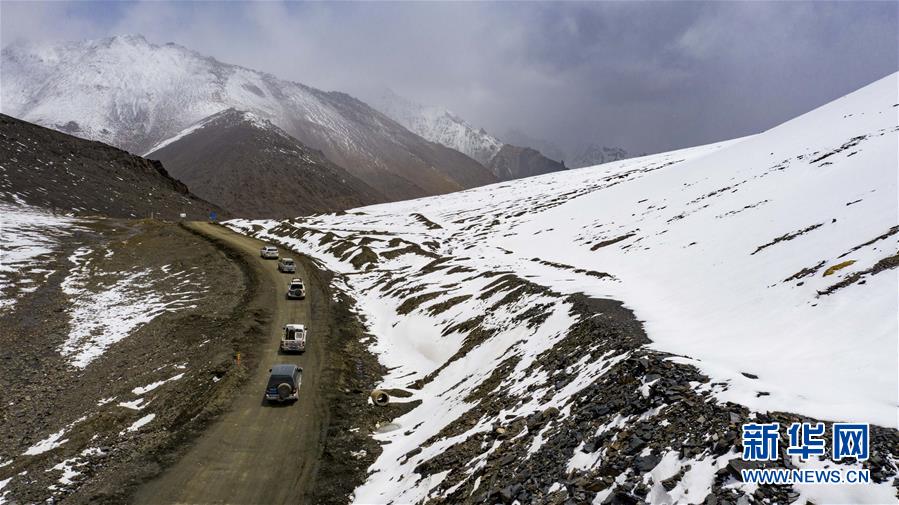新疆塔什庫(kù)爾干塔吉克自治縣文工團(tuán)演員開(kāi)車(chē)翻越雪山達(dá)坂,前往達(dá)布達(dá)爾鄉(xiāng)熱斯喀木村演出(6月5日攝,無(wú)人機(jī)照片)。新華社記者胡虎虎攝