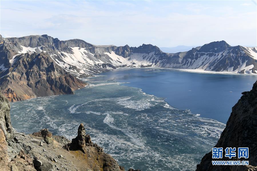 這是6月12日拍攝的長(zhǎng)白山天池。近日,長(zhǎng)白山天池冰層逐漸消融,迎來(lái)“開(kāi)冰季”。新華社記者 林宏 攝