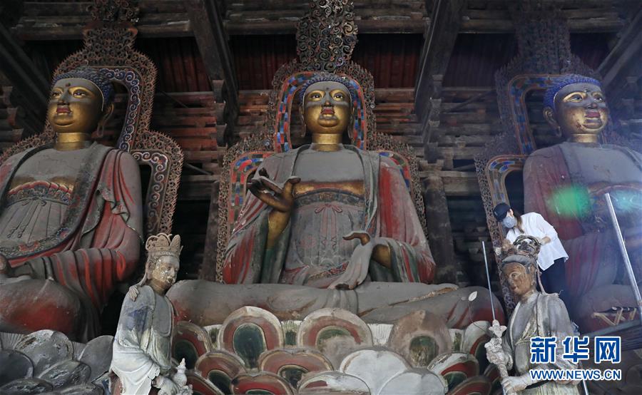 6月8日,工作人員對奉國寺的彩繪泥塑進行保護修復(fù)。新華社記者 姚劍鋒 攝