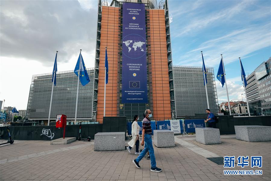 6月13日,在比利時布魯塞爾,戴口罩的行人走過歐盟委員會總部大樓。新華社記者 張鋮 攝