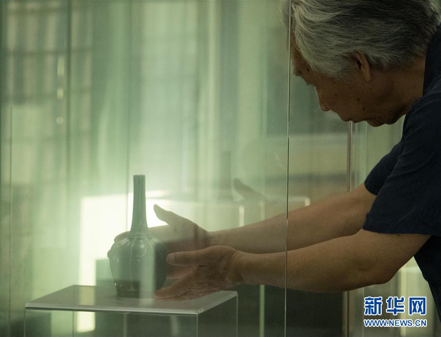 6月17日,在位于浙江慈溪的工作室,聞長慶從展示柜里拿起一件自己燒制的秘色瓷八棱凈瓶。新華社記者 翁忻旸 攝