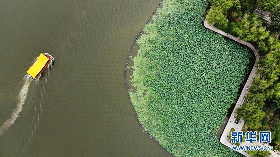 6月19日拍攝的大明湖畔的荷花池(無(wú)人機(jī)照片)。近日,山東濟(jì)南大明湖的荷花陸續(xù)綻放,吸引游客前來(lái)觀賞。新華社記者 王凱 攝