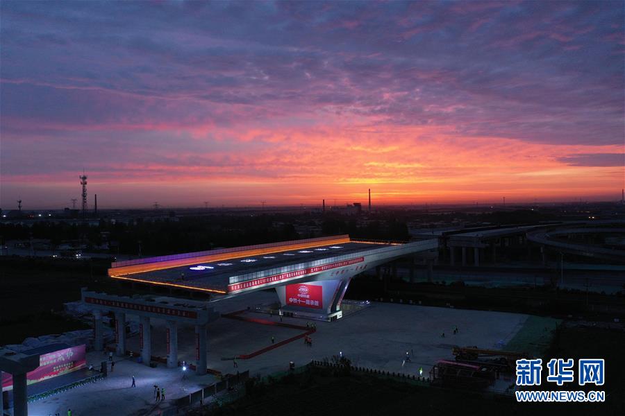 G107河北邢臺段繞城上跨京廣鐵路轉(zhuǎn)體橋?qū)崿F(xiàn)成功轉(zhuǎn)體(6月16日無人機照片)。6月16日凌晨,由中鐵十一局承建的G107河北邢臺段繞城上跨京廣鐵路轉(zhuǎn)體橋成功完成歷時60分鐘的空中轉(zhuǎn)體。這座單墩雙肢結(jié)構(gòu)轉(zhuǎn)體橋,轉(zhuǎn)體段長100米、寬34.5米,梁體總重達14200噸。新華社記者朱旭東攝