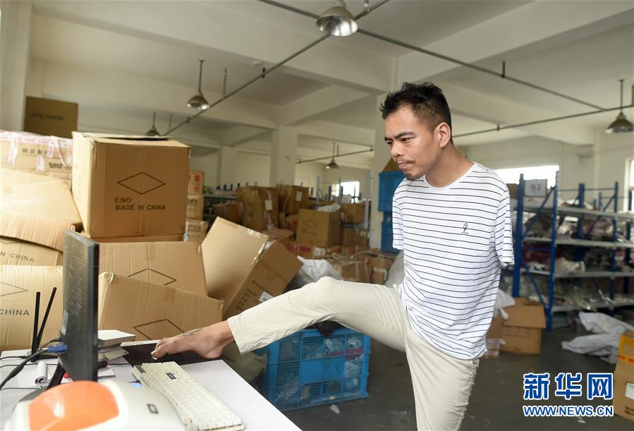 6月12日,金江偉用腳控制鼠標打印網(wǎng)店訂單。今年34歲的金江偉是浙江省諸暨市楓橋鎮(zhèn)樂山村村民。5歲時的一場意外讓他失去了雙臂,但金江偉沒有向命運屈服。從2016年起,金江偉和弟弟開始在電商領(lǐng)域創(chuàng)業(yè),開網(wǎng)店銷售襪子,金江偉負責網(wǎng)店策劃和客服。經(jīng)過苦練,他用腳打字的速度已經(jīng)與常人無異。在他的努力下,這幾年網(wǎng)店年銷售額超過100萬元。新華社記者韓傳號攝