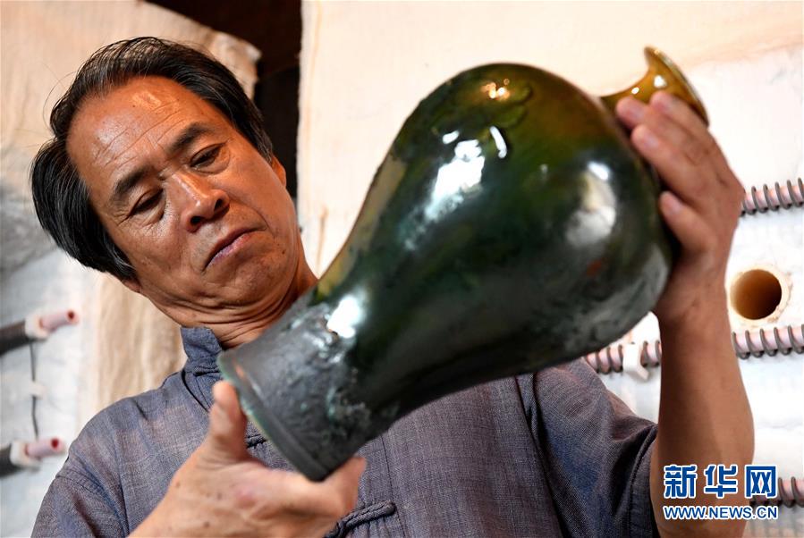 在河南省鞏義市站街鎮(zhèn)小黃冶村的工作室里,游光明在查看他燒制的“三彩雕花杯”(6月19日攝)。