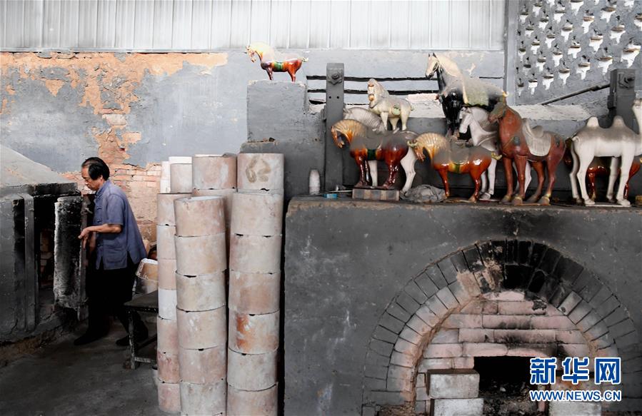在河南省鞏義市站街鎮(zhèn)小黃冶村的工作室里,游光明在裝窯(6月19日攝)。新華社記者李安攝