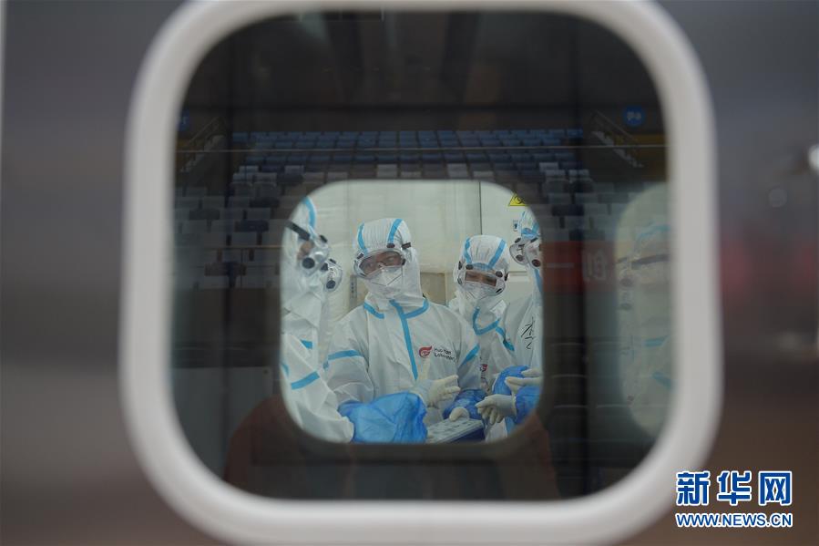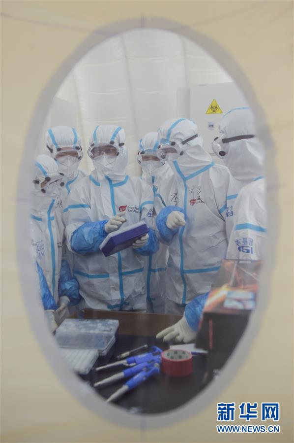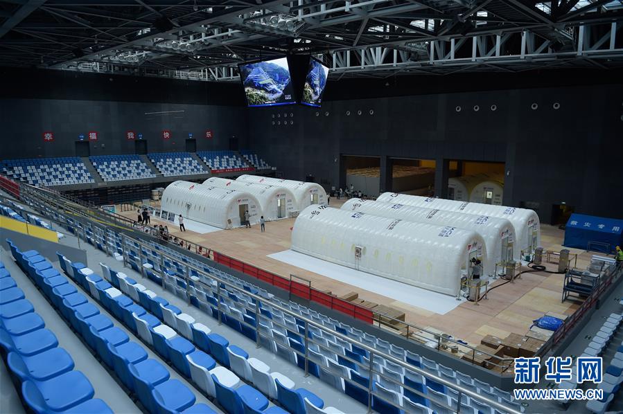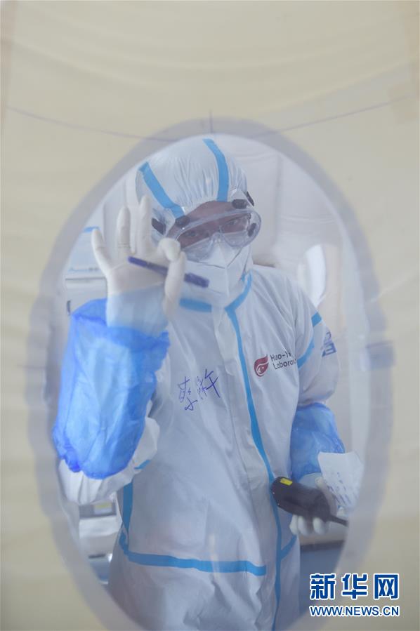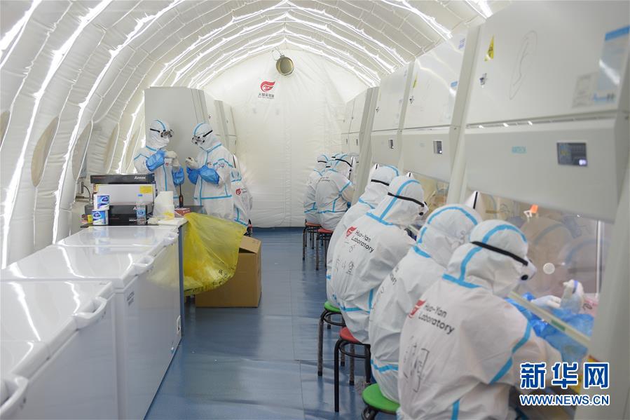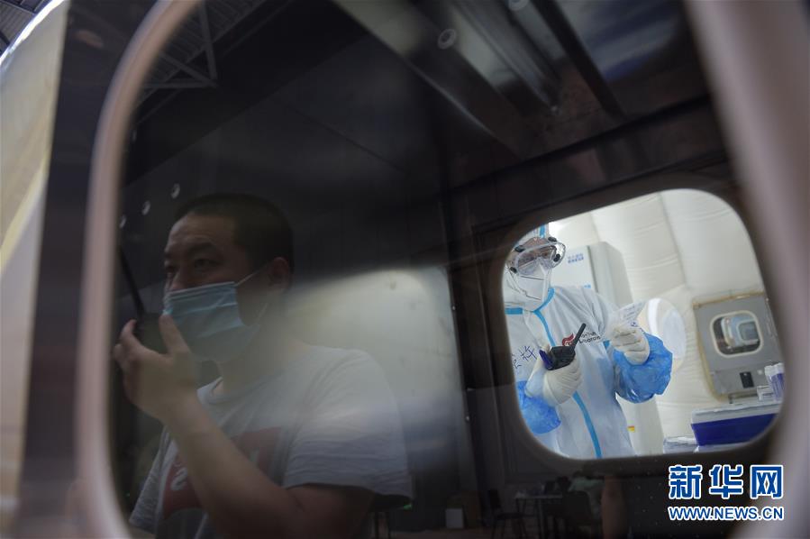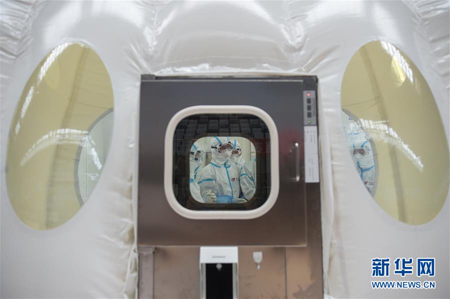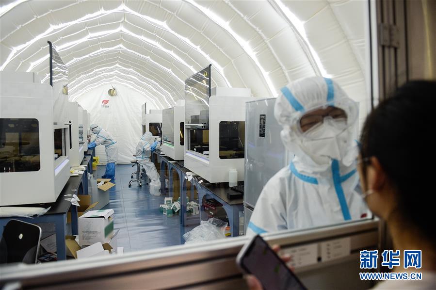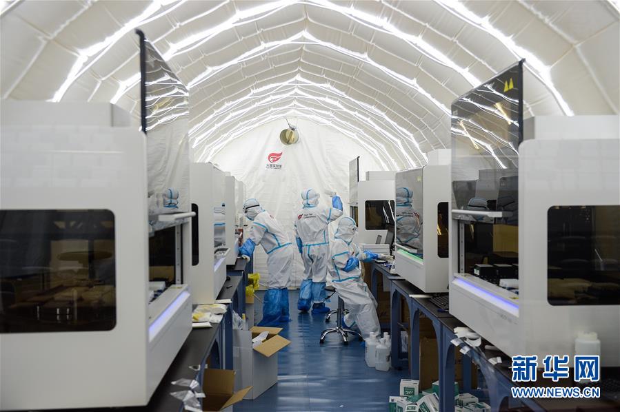 出于北京市疫情防控工作的需要,北京大興區(qū)體育中心綜合館內(nèi)正在搭建一個可移動、自動化、大通量的核酸檢測實驗室。目前,工人們正在緊張地進行設(shè)備安裝和調(diào)試。據(jù)介紹,氣膜版“火眼”核酸檢測實驗室6月19日下午開始搭建。兩天多時間基本上完成了設(shè)備安裝和調(diào)試。9個高3.5米、占地70多平方米的拱形白色氣膜艙已搭建完畢,14臺自動化核酸提取設(shè)備準備就緒。這個北京首座氣膜版“火眼”核酸檢測實驗室正式運轉(zhuǎn)后,實驗室核酸檢測能力可達到每天上萬人份,緩解當(dāng)前核酸檢測壓力。新華社記者彭子洋攝
