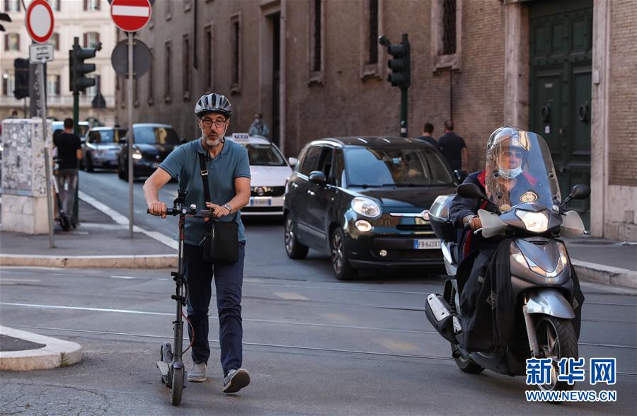 6月23日,在意大利首都羅馬,一名男子推著電動(dòng)踏板車過馬路。新華社記者程婷婷攝