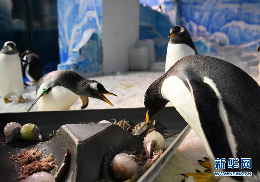 6月24日,哈爾濱極地館的企鵝在享用工作人員送來的美食。當(dāng)日,哈爾濱極地館的工作人員特地準(zhǔn)備了“魚粽”“肉粽”,讓生活在這里的極地動物也品嘗一下端午美食。新華社記者王建威攝