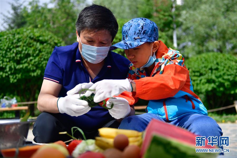 6月25日,在青海省西寧野生動(dòng)物園,一位小朋友在父親的幫助下包粽子。新華社記者 張龍 攝
