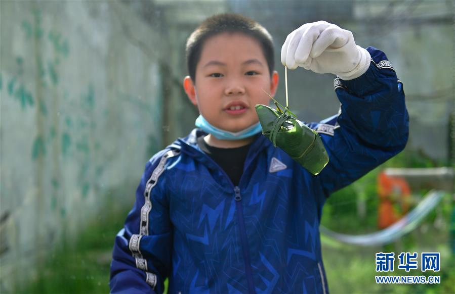 6月25日,在青海省西寧野生動(dòng)物園,一位小朋友在展示自己包的粽子。新華社記者 張龍 攝