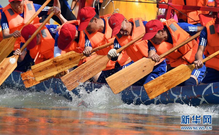 6月25日,參賽龍舟隊在比賽中。當日是農歷五月初五,是中國民間的傳統(tǒng)節(jié)日端午節(jié)。陜西省安康市第20屆龍舟節(jié)在漢江上舉行。每年端陽節(jié)前后,安康沿江一帶的縣區(qū)都舉行龍舟賽,賽龍舟成為民間自發(fā)的盛大活動。新華社記者 陶明 攝