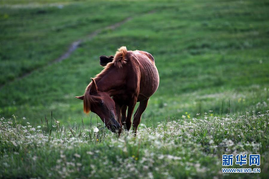 一匹馬在新疆喀納斯景區(qū)內吃草(6月24日攝)。新華社記者 沙達提 攝