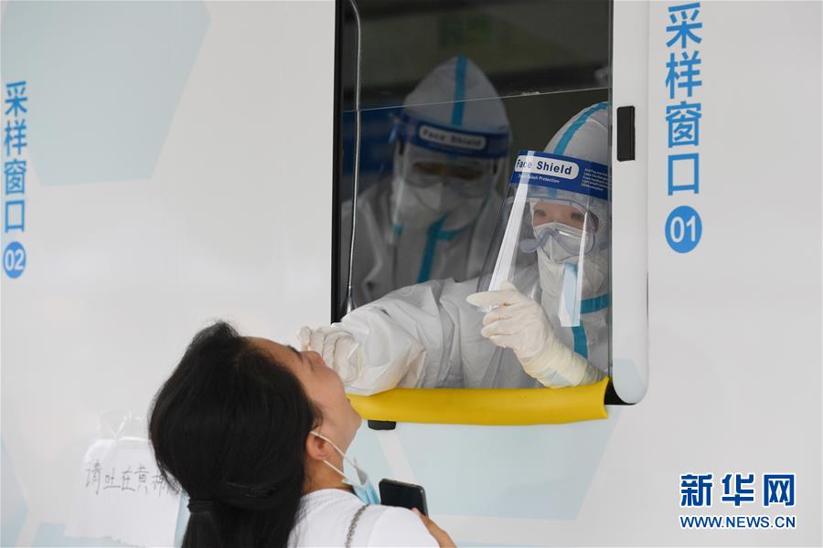 6月28日,在北京市西城區(qū)北京展覽館南側(cè)的露天廣場(chǎng)核酸檢測(cè)采樣點(diǎn),核酸檢測(cè)采樣車(chē)內(nèi)的醫(yī)護(hù)人員為前來(lái)做檢測(cè)的人員進(jìn)行采樣。新華社記者鞠煥宗攝