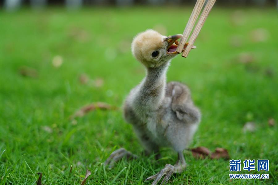 6月29日,工作人員在給蓑羽鶴寶寶喂食。新華社記者周密攝
