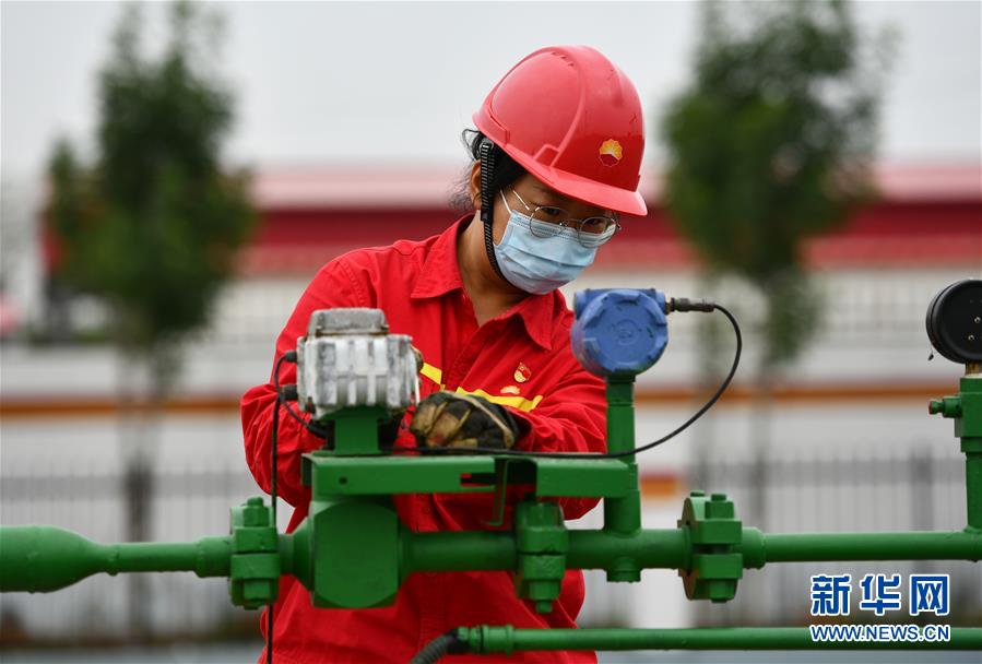 6月29日,馮萌萌在大港油田采油二廠二區(qū)內(nèi)查看設(shè)備運行情況。新華社記者李然攝