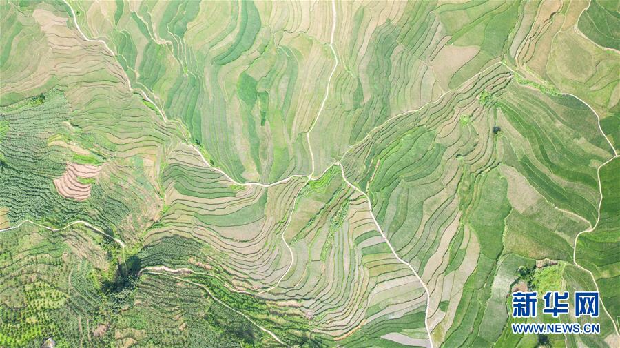 貴州省盤州市新民鎮(zhèn)的梯田風(fēng)光(6月29日攝,無人機照片)。夏日時節(jié),貴州省盤州市新民鎮(zhèn)的梯田風(fēng)景如畫。新華社記者陶亮攝