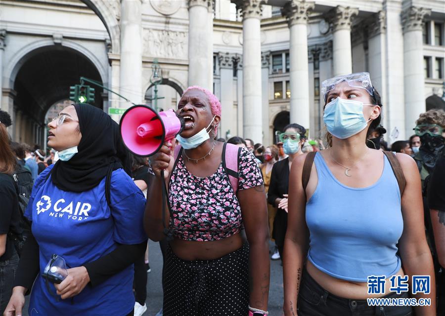 6月30日,人們在美國紐約市政廳附近參加抗議活動(dòng)。由美國明尼蘇達(dá)州明尼阿波利斯市非裔男子弗洛伊德遭白人警察暴力執(zhí)法而死一事引發(fā)的各種抗議活動(dòng)仍在紐約持續(xù)進(jìn)行。新華社記者王迎攝