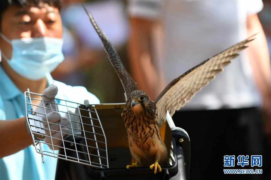 7月1日,在吉林省東北虎園,工作人員放飛一只紅隼。新華社記者林宏攝