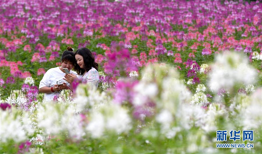 7月1日,市民在位于留壩縣城的金水灣花海拍照。近日,陜西省漢中市留壩縣金水灣花海的各類鮮花次第綻放,絢麗繽紛。新華社記者劉瀟攝