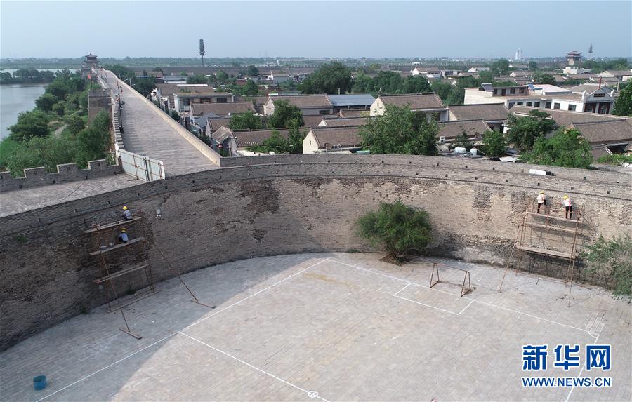 7月2日,工作人員在永年廣府古城修繕城墻(無人機(jī)照片)。經(jīng)國家文物局和河北省文物局批準(zhǔn),河北永年廣府古城修繕工程已全面啟動。在文物專家全程參與下,按照“不改變文物原狀”原則進(jìn)行修繕,預(yù)計2021年4月底完工。永年廣府古城擁有華北地區(qū)保存最完整的古城墻,現(xiàn)為全國重點(diǎn)文物保護(hù)單位。新華社記者王曉攝