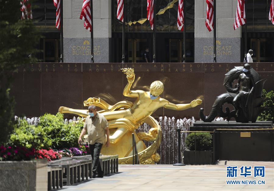 7月4日,一名男子從美國紐約洛克菲勒中心一尊戴口罩的雕像前走過。當(dāng)日是美國獨(dú)立日,美國多地疫情仍面臨嚴(yán)峻形勢。美國約翰斯·霍普金斯大學(xué)實(shí)時統(tǒng)計(jì)數(shù)據(jù)顯示,美國累計(jì)新冠確診病例4日已超過280萬例。新華社記者王迎攝