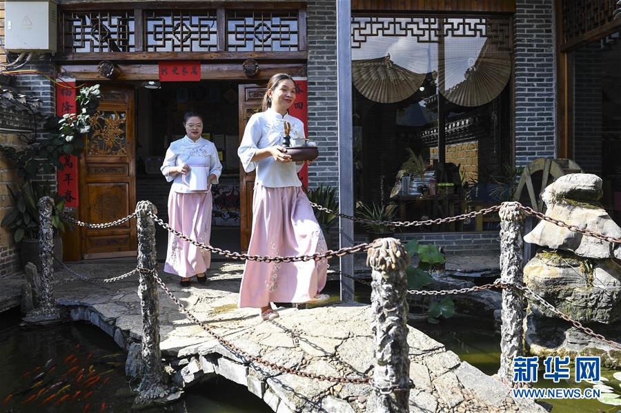 7月4日,服務員在廣西陽朔一家民宿內忙碌。她們是陽朔縣陽朔鎮(zhèn)的村民。新華社記者曹祎銘攝