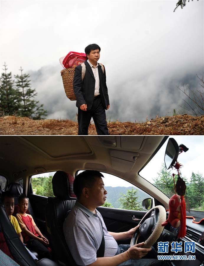 這是一張拼版照片,上圖:在廣西龍勝龍脊鎮(zhèn)江柳村,余啟貴老師背著背簍領(lǐng)著學(xué)生去學(xué)校(2013年2月26日攝);下圖:在廣西龍勝龍脊鎮(zhèn)江柳村,余啟貴老師開著自己的汽車帶著學(xué)生去學(xué)校(7月7日攝)。新華社記者陸波岸攝