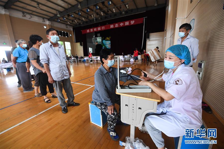 7月8日,在杭州市富陽區(qū)東洲街道安置點(diǎn)東洲中心小學(xué),醫(yī)護(hù)人員在給村民測(cè)量血壓。新華社記者徐昱攝