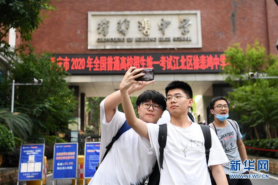 7月8日,在重慶市徐悲鴻中學(xué)考點(diǎn),考生在考試結(jié)束后在校門(mén)口合影。當(dāng)日,全國(guó)部分地區(qū)2020年高考結(jié)束。新華社記者唐奕攝