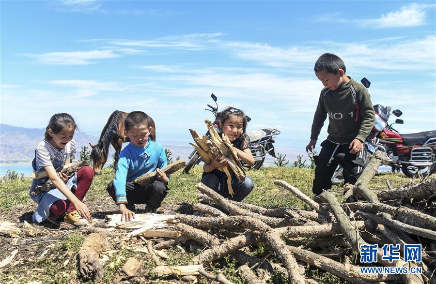 在新疆特克斯縣境內(nèi)的夏牧場(chǎng)里,小朋友在幫家人拾柴(7月2日攝)。新華社記者王菲攝