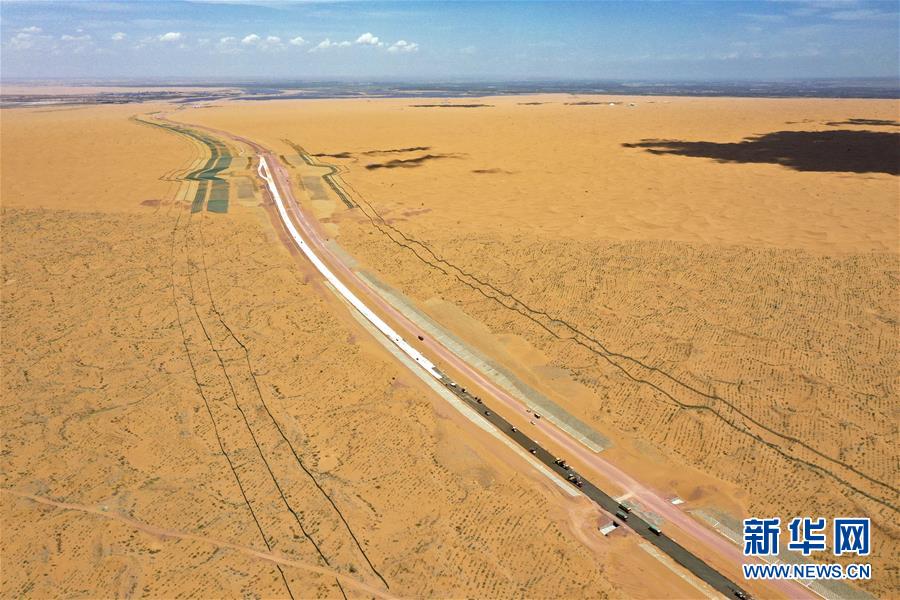7月10日,位于寧夏境內(nèi)的烏瑪高速青銅峽至中衛(wèi)段A10標(biāo)段在施工中(無(wú)人機(jī)照片)。盛夏時(shí)節(jié),位于寧夏境內(nèi)的烏瑪(內(nèi)蒙古烏海市至青海瑪沁縣)高速青銅峽至中衛(wèi)段正在抓緊施工建設(shè)。該路段主線全長(zhǎng)122.9公里,其中穿越騰格里沙漠腹地的18公里公路是寧夏建設(shè)的首條沙漠高速公路,預(yù)計(jì)2021年建成通車(chē)。新華社記者馮開(kāi)華攝。