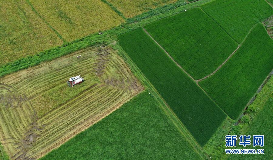 7月11日,在湖南省衡陽市衡陽縣臺源鎮(zhèn)臺九村,村民駕駛收割機收割早稻(無人機照片)。近日,湖南各地農村陸續(xù)進入“雙搶”季,農民緊抓農時,搶收搶種,力爭糧食穩(wěn)產豐收。新華社記者趙眾志攝