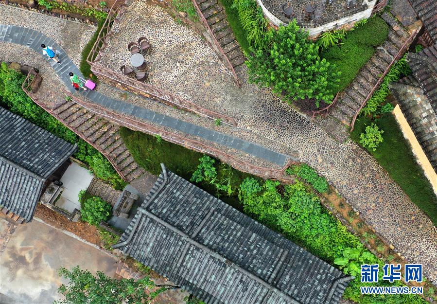 7月11日,游客行走在金秀瑤族自治縣六巷鄉(xiāng)一處民宿內(nèi)(無人機照片)。近年來,廣西金秀瑤族自治縣依托當?shù)刈匀簧鷳B(tài)優(yōu)勢,圍繞境內(nèi)豐富的瑤族文化,大力發(fā)展鄉(xiāng)村旅游,精心打造一批獨具瑤族特色的山間民宿酒店,取得良好經(jīng)濟效益。新華社記者 周華 攝