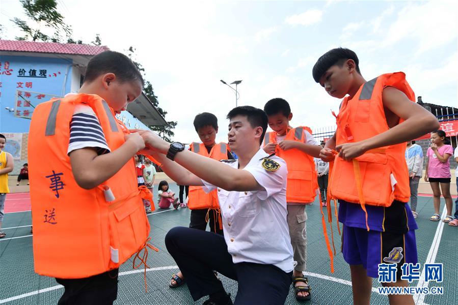 7月13日,在廣西融水苗族自治縣桿洞鄉(xiāng)黨鳩小學(xué),融水海事處工作人員指導(dǎo)學(xué)生穿救生衣。當(dāng)日,廣西柳州融水海事處在桿洞鄉(xiāng)黨鳩小學(xué)開展防溺水及水上交通安全知識教育活動,向?qū)W生們普及水上安全知識,并講解水上應(yīng)急救援技能。新華社記者 黃孝邦 攝